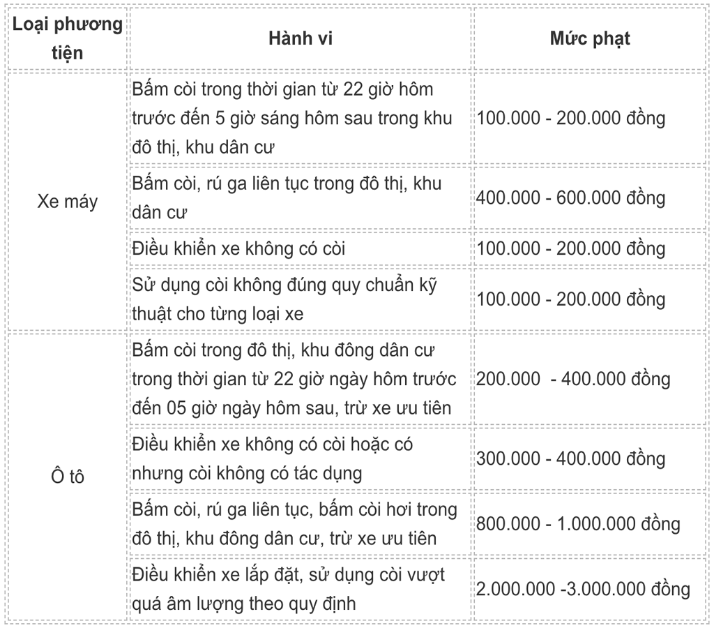 - Bấm còi hoặc gây ồn ào, gây ra tiếng động lớn làm ảnh hưởng đến sự yên tĩnh trong khu đô thị, khu vực đông dân cư từ 22h tối hôm trước đến 5h sáng hôm sau: bị phạt tiền từ 100.000 - 200.000 đồng (trừ những xe ưu tiên đi làm nhiệm vụ).