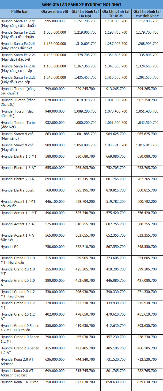 Bảng giá xe Hyundai 2021 mới nhất tại Việt Nam
