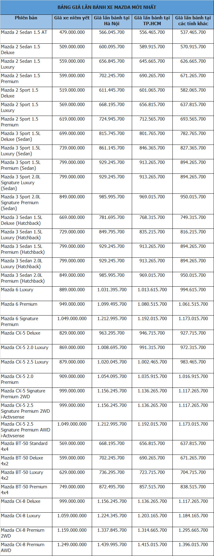 Bảng giá xe Mazda 2021 mới nhất tại Việt Nam