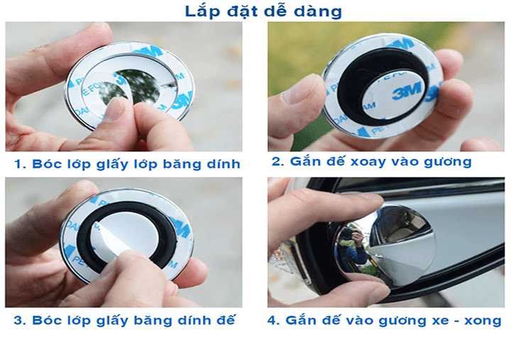 Cách lắp: Lột giấy ở miếng dính của gương rồi dán vào góc kính chiếu hậu là xong.