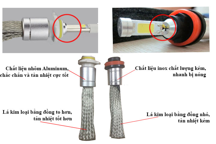 So sánh chất lượng giữa đèn LED R3 chính hãng (Bên trái) và sản phẩm đèn LED R3 trôi nổi trên thị trường (Bên phải)