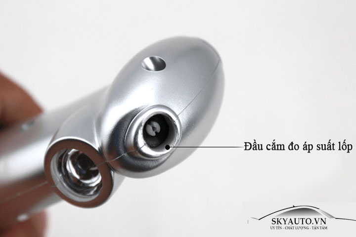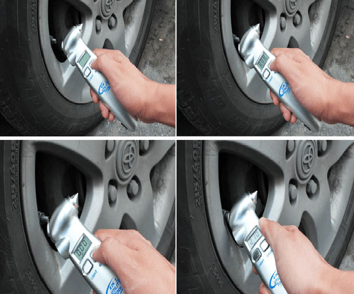 - Để đầu đo áp suất lốp vào van xe và chắc chắn rằng không bị hở khí. Giữ nguyên cho đến khi các thông số trên màn hình dừng lại.