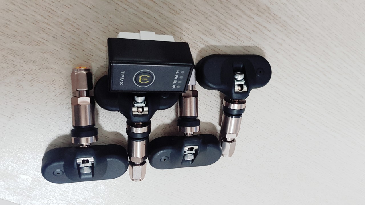 Bộ sản phẩm cảm biến áp suất lốp gồm 4 van cảm biến và 1 host, 1 sách hướng dẫn sử dụng.