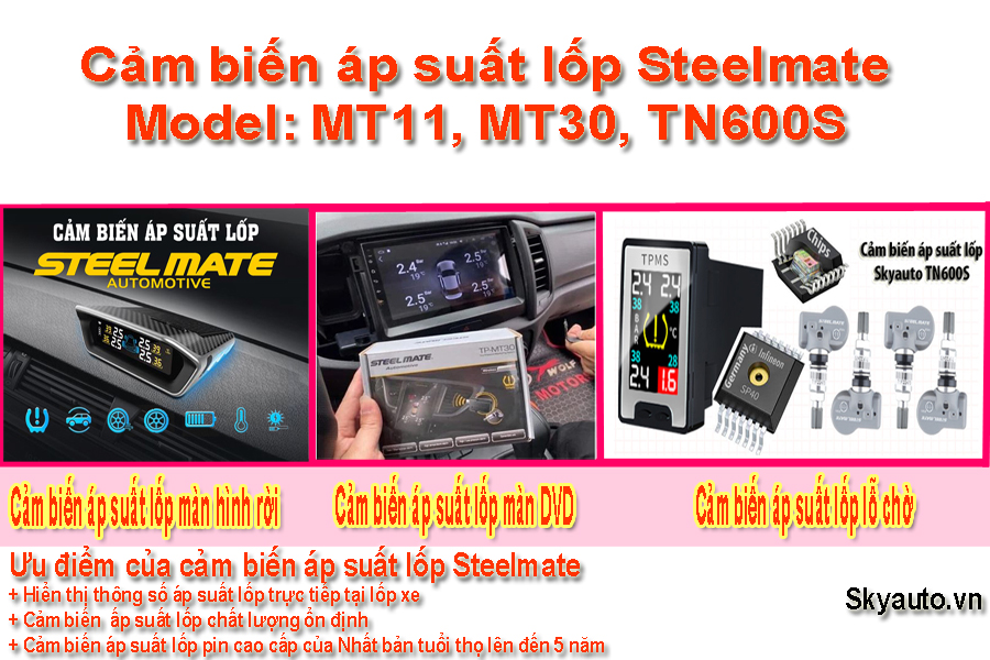 Cảm biến áp suất lốp Steelmate là sản phẩm nổi tiếng trên toàn thế giới. Các sản phẩm của thương hiệu này đa dạng mẫu mã và giá thành. Một trong số những dòng sản phẩm tiêu biểu của hãng như: TP-E3, T302, T060, TP79, TPS1, TP05,… Mỗi sản phẩm lại có những ưu điểm, lợi ích riêng để đáp ứng cho nhu cầu của người sử dụng.