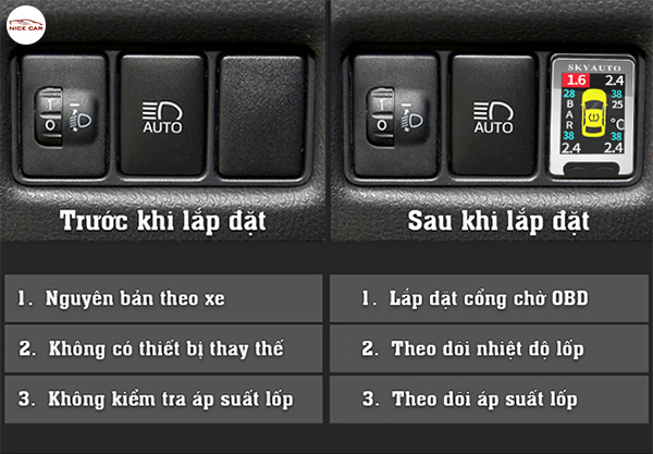 Trước và sau lắp đặt cảm biến áp suất lốp TN600s, mang lại sự sang trọng cho chủ xe ô tô.