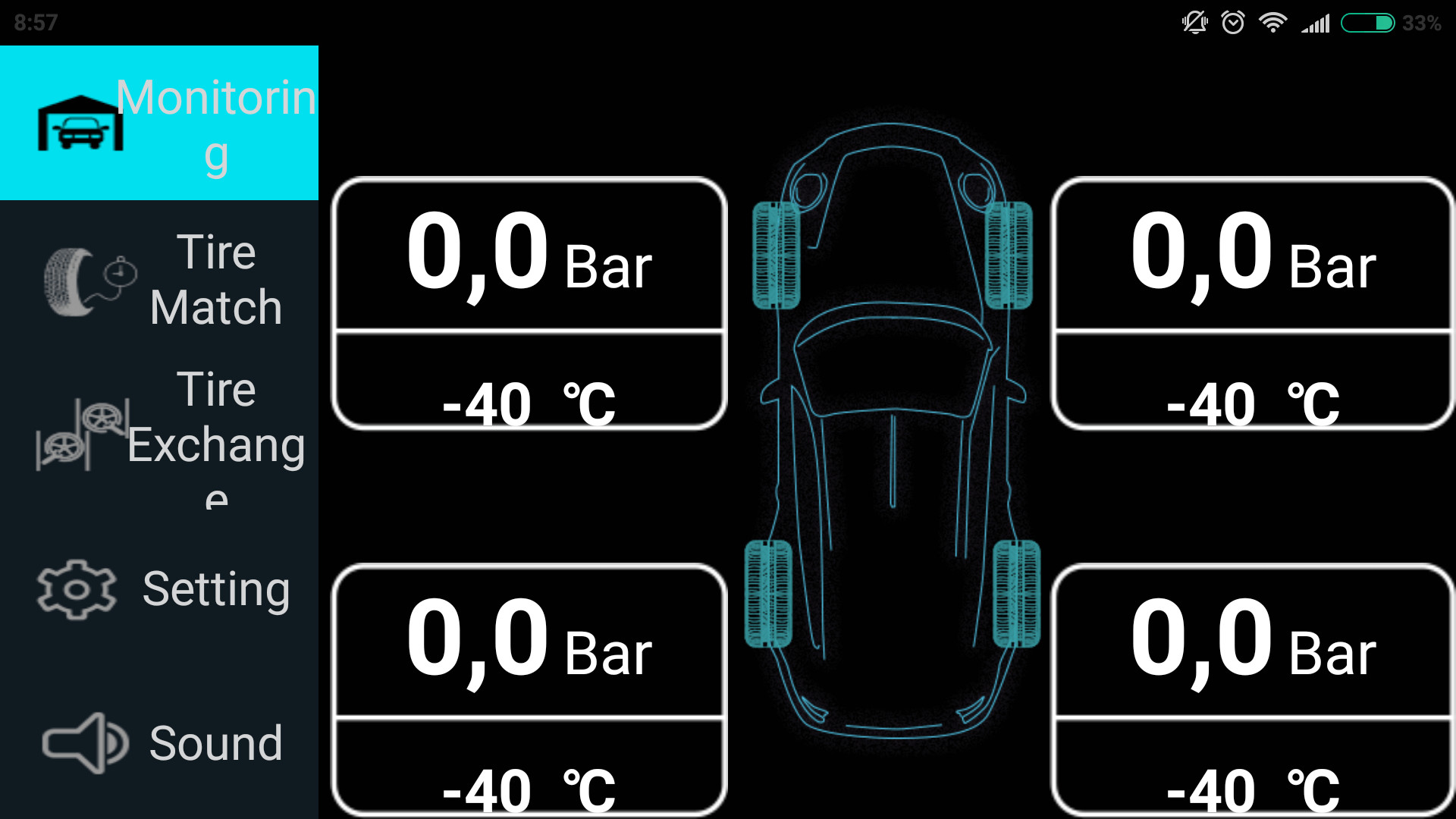 Sau khi mở ứng dụng ra thì bạn có thể sử dụng và cài đặt các chức năng. Nếu áp suất là 0 Bar và nhiệt độ là -40 độ có nghĩa là chưa nhận được tín hiệu từ van, cũng có nghĩa là đã cài đặt APP hoàn tất và có thể tiến hành lắp van cảm biến vào.