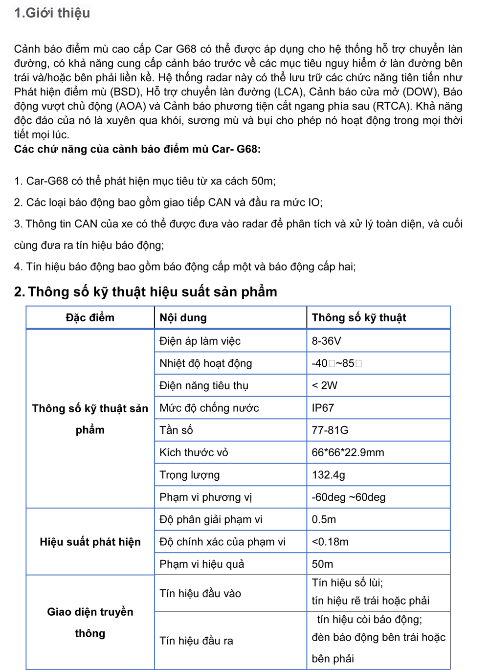 Với cấu hình cao cấp và được xây dựng theo tiêu chuẩn đáp ứng cung cấp cho các hệ thống showroom 4S, do vậy việc thiết kế luôn tính toán đảm bảo phù hợp với tiêu chuẩn, ngoài ra trên thị trường thiết kế thêm hộp điều khiển ngoài, còn với sản phẩm Cảnh báo điểm mù Car-G68 này toàn bộ sản phẩm và phần mềm tích hơp trên 2 radar, nên tỷ lệ lỗi hỏng rất ít khi xảy ra.