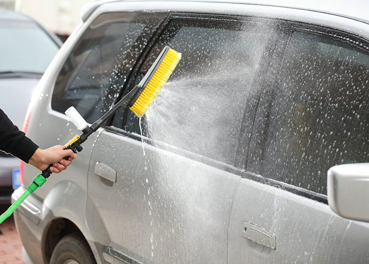 1. Phun nước và xà phòng rửa sạch bụi bẩn và làm bở bùn đất bám trên xe.