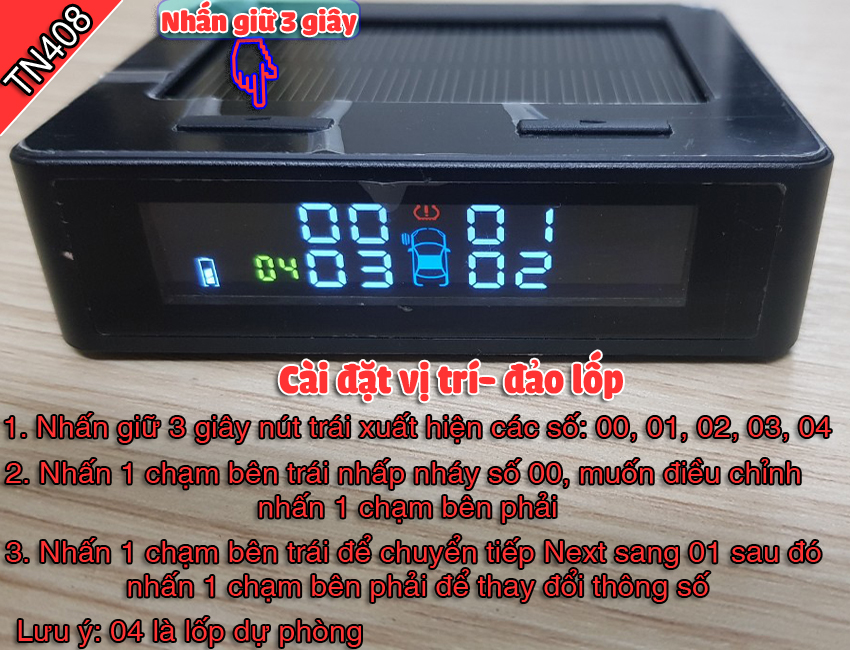 Trước tiên màn hinh phải được bật nguồn. Sau đó chỉ cần giữ nút trên bên trái khoảng 3 giây sau đó nó xuất hiện hàng số tuần từ từ trái qua phải là: 00, 01, 02, 03, và 04 phía dưới góc, đó là vị trí của lốp dự phòng. Muốn đổi vị trí nhấn 1 chạm nút bên trái, khi đó nó nhấp nháy và nhấn 1 chạm bên phải để thay đổi thống số so cho thích hợp.