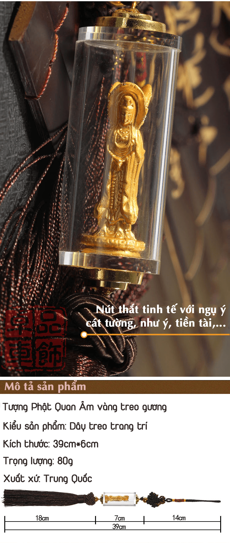 Dây treo xe ô tô hình Quán Thế Âm Bồ Tát Ngồi thực sự là một kiệt tác treo xe hơi, được để trong lồng thủy tinh trong suốt. Viền trên và dưới Lồng được điểm các viên đá trang trí rất đẹp, Tượng Quan Âm được phủ một lớp xỉ vàng cao cấp, uy nghiêm.