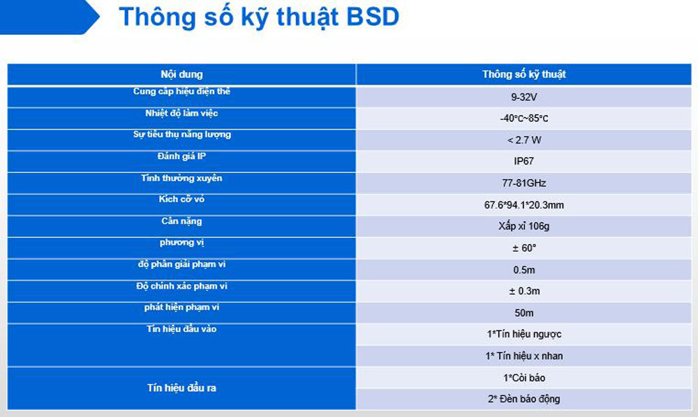 Thông số hệ thống cảnh báo điểm mù cao cấp