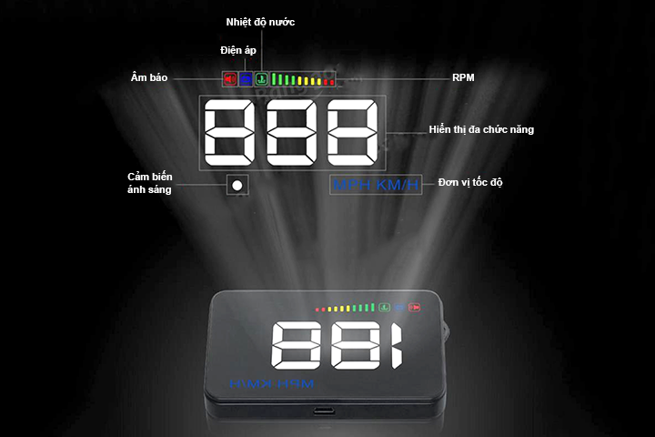 - Kích thước HUD: 9 * 5,4 * 1,2 (cm).
