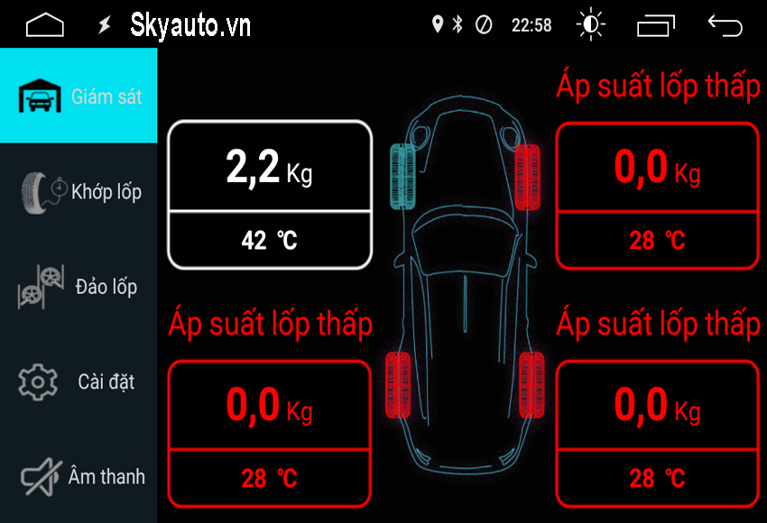 Phía thanh Tab bên trái có những ứng dụng như: giám sát- mở màn hình chính, tiếp theo là khớp lốp, đảo lốp, cài đặt, và tắt âm thanh.