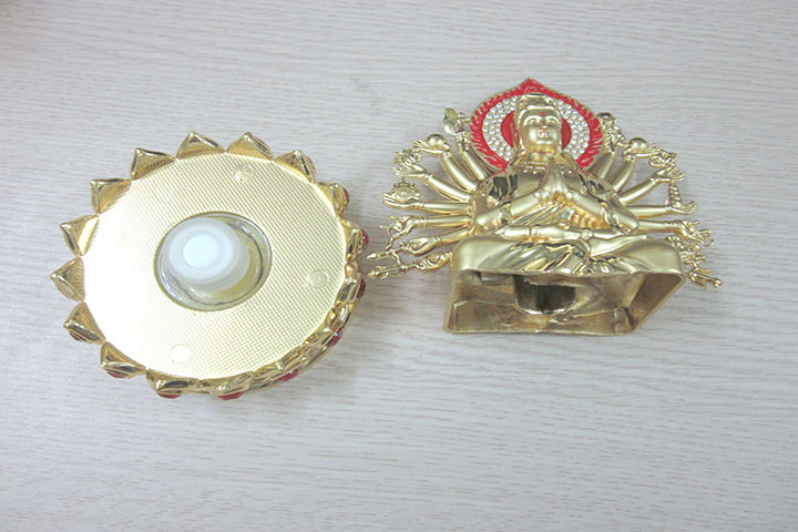 - Tượng Quan Thế Âm Bồ Tát được thiết kể với đài hoa sen được đính những viên hồng ngọc sáng bóng, trông rất đẹp. Đế nước hoa rất kín đáo có thể mang lại nhiều hương thơm khi đặt trên xe.