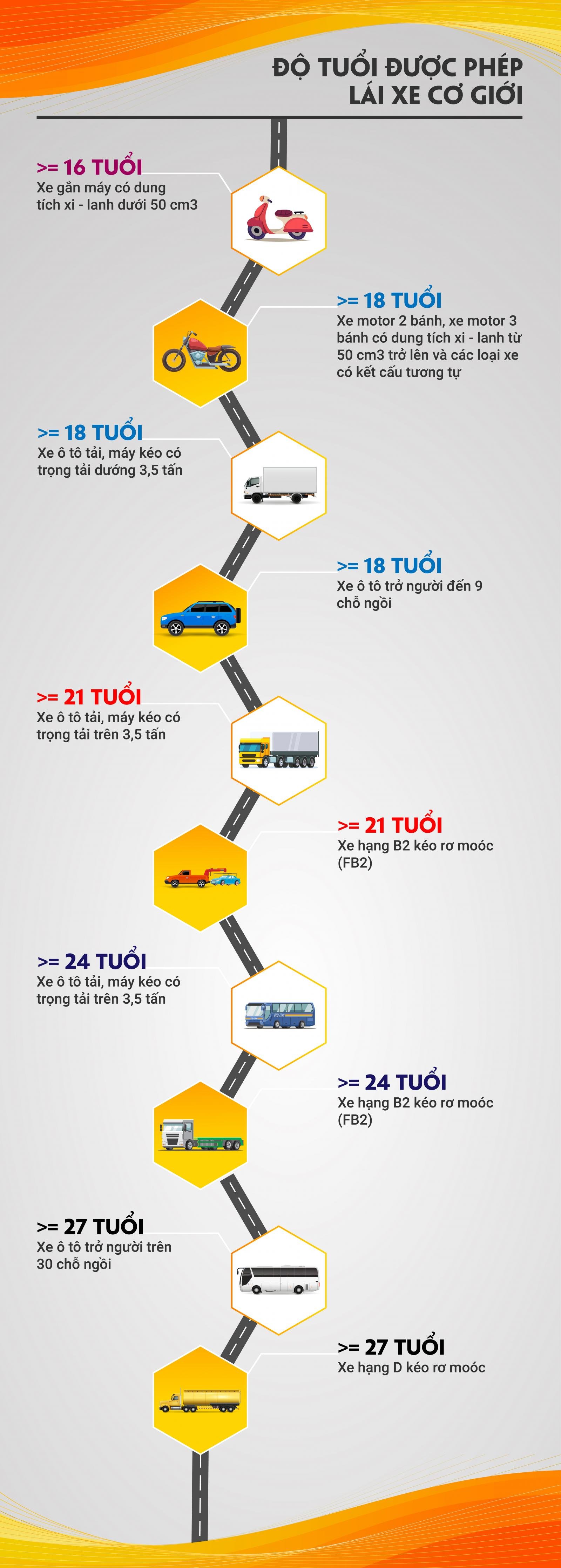 b) Người đủ 18 tuổi trở lên được lái xe mô tô hai bánh, xe mô tô ba bánh có dung tích xi-lanh từ 50 cm3 trở lên và các loại xe có kết cấu tương tự; xe ô tô tải, máy kéo có trọng tải dưới 3.500 kg; xe ô tô chở người đến 9 chỗ ngồi;