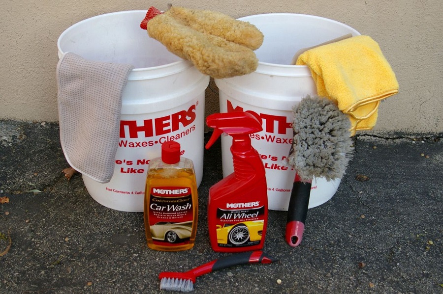 - Chuẩn bị dung dịch rửa xe: cho khăn mềm lau thân xe, mâm xe vào 1 xô nước, cho xà phòng, bàn chải, khăn lau để rửa bánh xe vào xô còn lại.