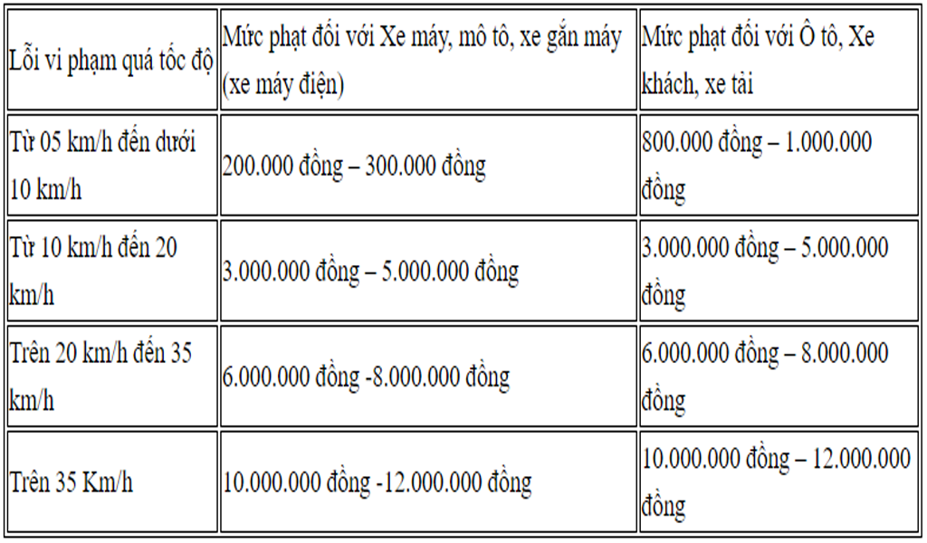 - Phạt tiền từ 10.000.000 đồng đến 12.000.000 đồng đối với người điều khiển xe chạy quá tốc độ quy định trên 35 km/h (Điểm c Khoản 7 Điều 5).